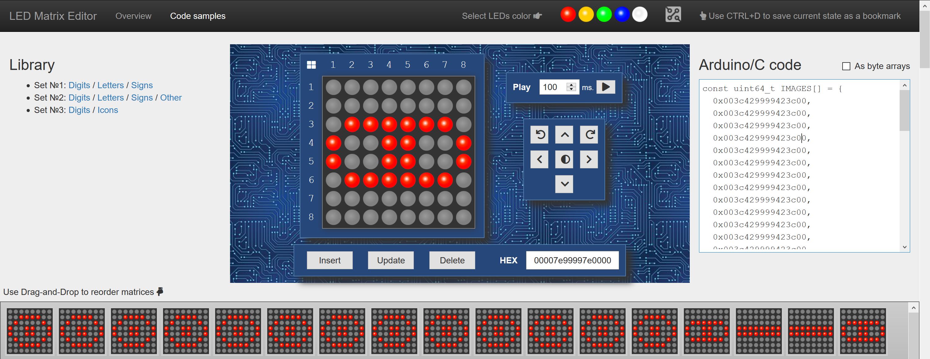 There is a great tool made by xantorohara to create the LED Matrix animations visually in our browser. We can easily export the animations as a program that we can upload to the Arduino. To use the project, go to this web address: http://xantorohara.github.io/led-matrix-editor/